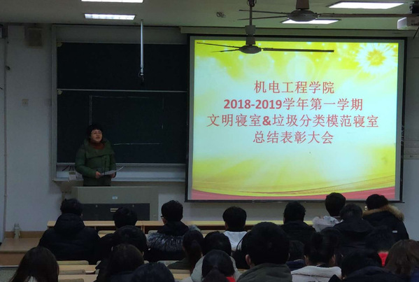 辅导员陈翔飞对本次“文明寝室”和“垃圾分类模范寝室”的评比规则和流程做了说明,对员工会生活部同学在评比过程中的付出表示感谢,强调了本次活动的积极意义。随后,范洪梅老师宣读获奖名单,并与叶云霞老师一起为获奖寝室颁奖。大会共表彰“文明寝室”12间,“垃圾分类模范寝室”6间。对受表彰的寝室给予精神和物质的双重奖励,既有锦旗和奖状也有日常生活用品。