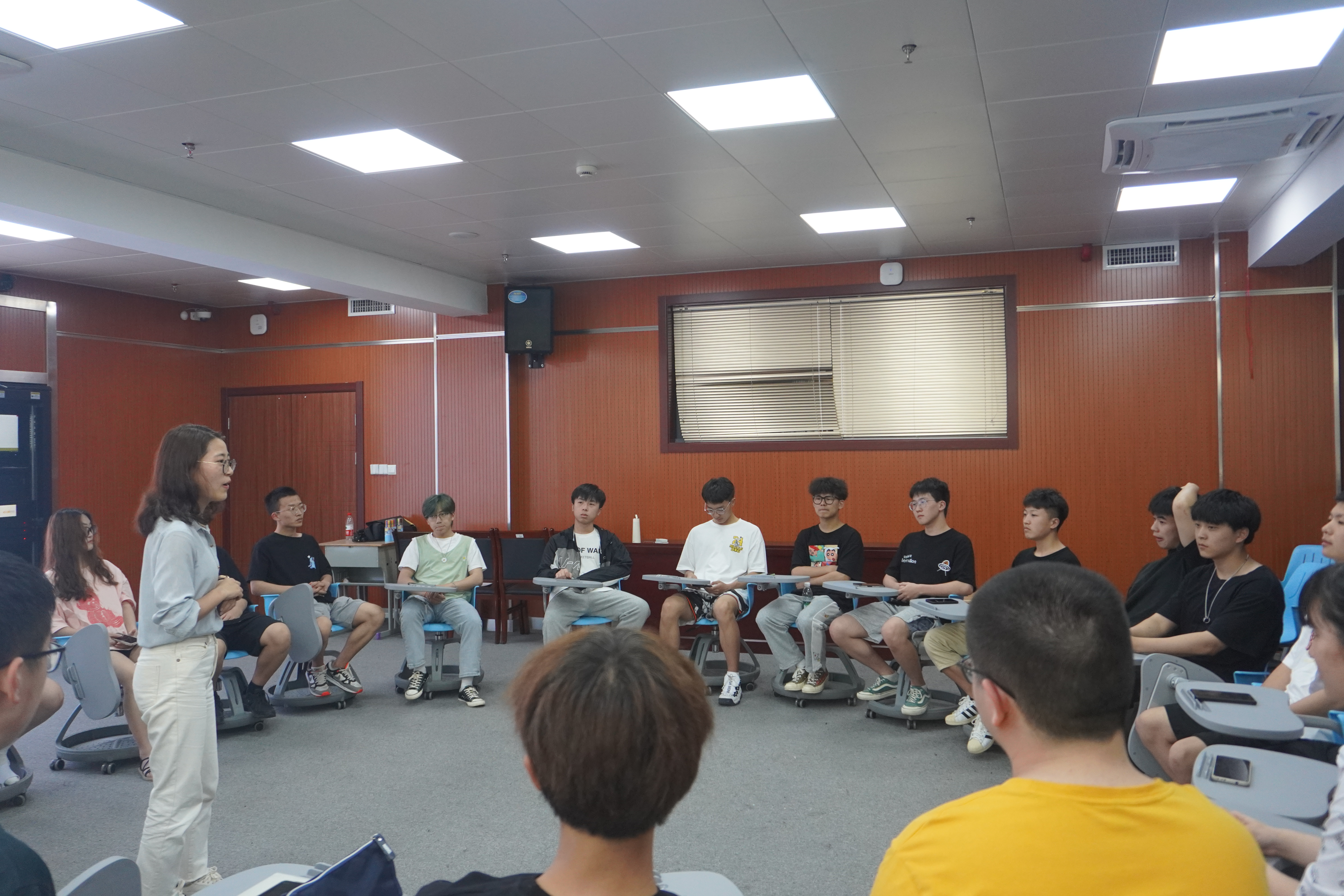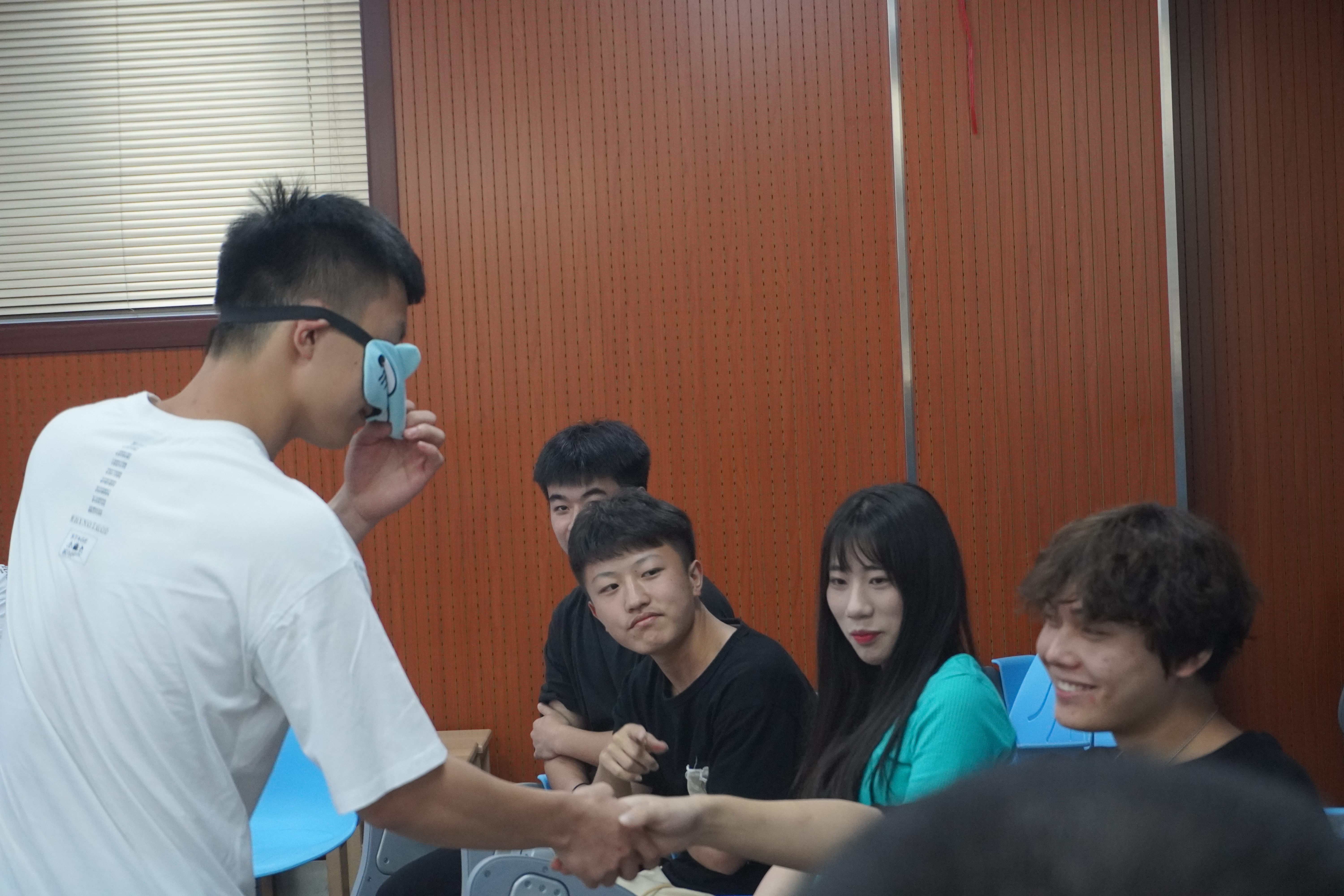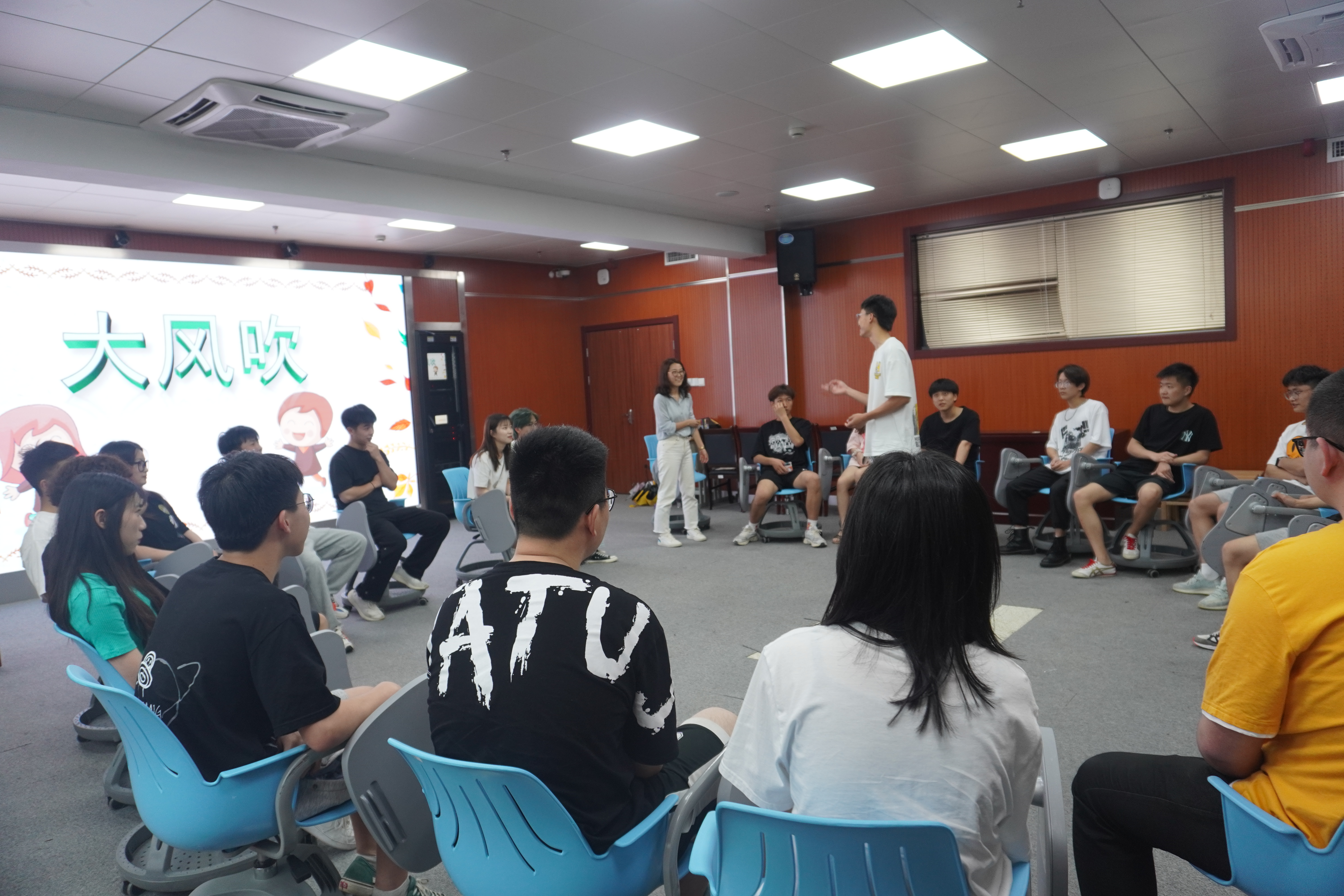 活动以暖场游戏“大风吹”开场。主持人让大家围成一个圆,站在圆圈中心的同学说:“大风吹”,其他同学回答:“吹什么?” 然后圈中同学说出一部分同学的特征,具有这些特征的同学就要站起来抢其他同学的座位,如果没抢到就要接受惩罚。一开始,同学们有些害羞,气氛不是很热烈。渐渐地,大家越吹越开心,拘谨感逐渐消失,也渐渐熟悉起来。