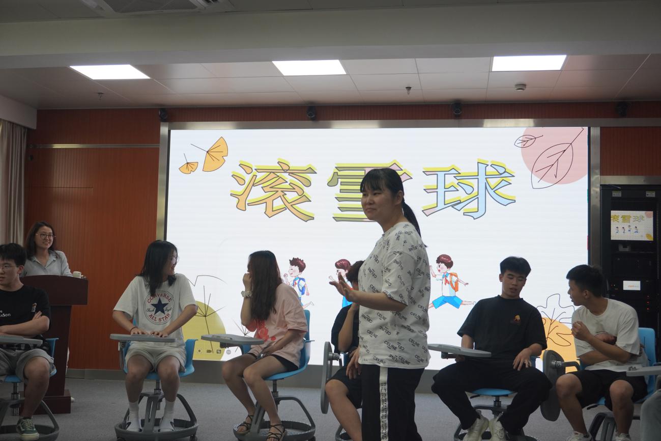 第三个环节是滚雪球。活动规则是小组成员先作自我介绍,后面的同学需要复述前面同学的信息,再作自我介绍。越到后面难度越大,以小组为单位进行记名字大pk,落后的小组就要接受才艺表演的小惩罚。