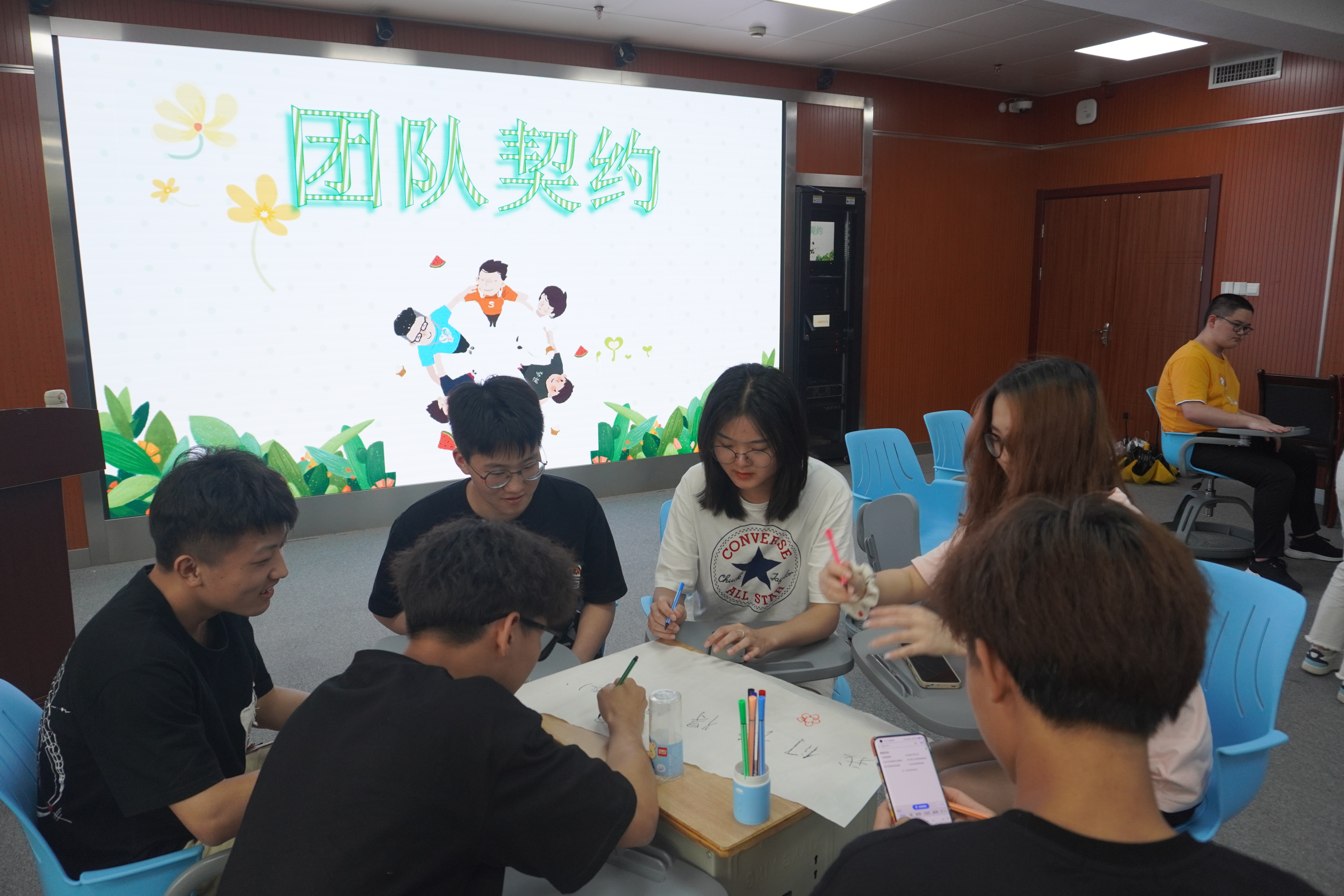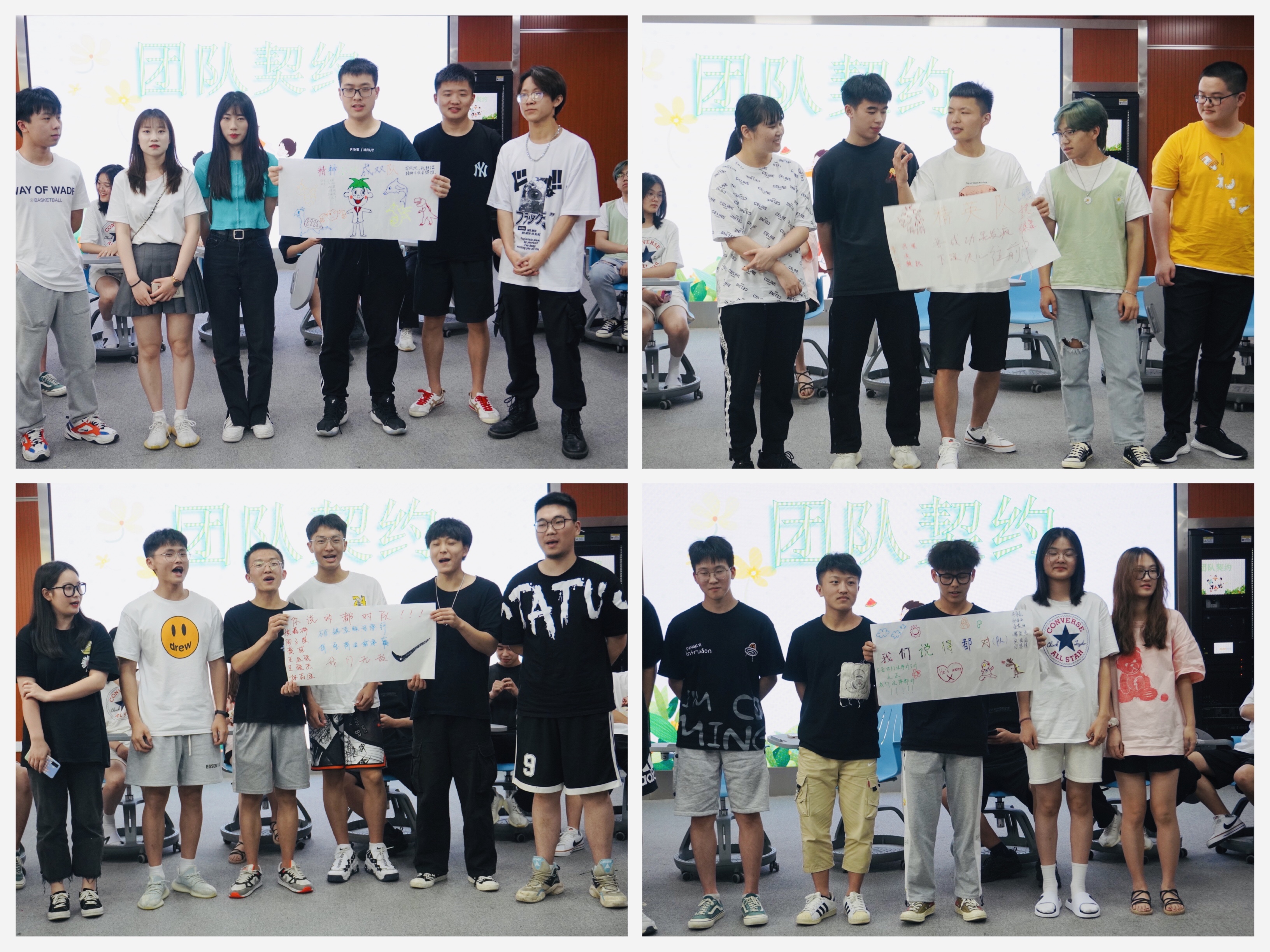 最后一个环节是订契约,同学们热烈地讨论、设计着小组的队名、口号和队徽,并一起上台展示。在展示的过程中充满了欢声笑语,大家的配合也越来越默契。