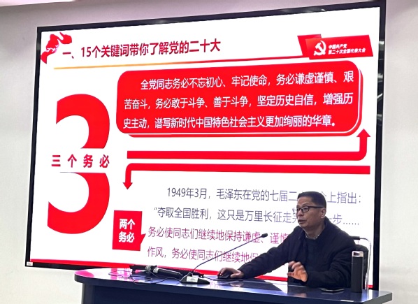 余建军从党的二十大报告和主题出发,以15个关键词,大会成果、意义和精神,以中国式现代化全面推进中华民族复兴和教育、科技、人才四个方面系统深入阐释了党的二十大精神。他指出,党的二十大报告是新时代十年伟大变革深刻昭示未来的郑重宣示,是马克思主义中国化时代化的纲领性文献,是以中国式现代化全面推进中华民族伟大复兴的行动指南,是跳出治乱兴衰历史周期率的时代答卷,是激励全党全国人民团结奋斗创造历史伟业的宣言书动员令。党的二十大是一次高举旗帜、凝聚力量、团结奋进的大会,大会作出的各项决策部署、取得的各项成果,必将对全面建成社会主义现代化强国、全面推进中华民族伟大复兴,对夺取新时代中国特色社会主义新胜利发挥十分重要的指导和保证作用。