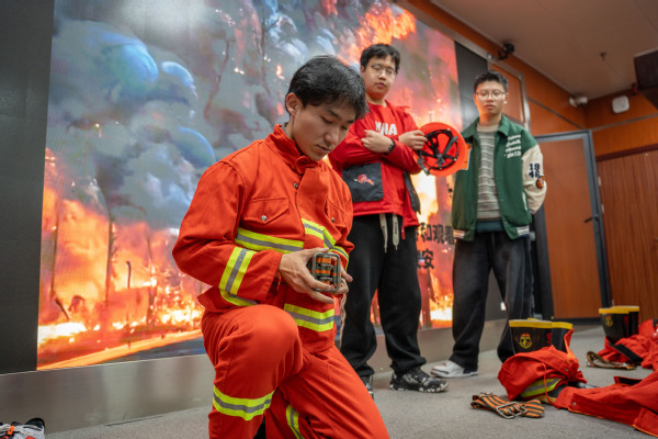 随后,班委在老师指导下进行消防服穿戴示范。厚重的消防胶鞋、消防服,搭配面罩与救援头盔,穿戴完整装备后行动极为不便,使员工们深切体会到消防员出任务的艰辛与不易,对消防工作者的敬佩之情也油然而生。