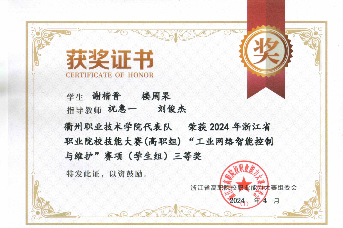 支部党员教师祝惠一参与指导,22机器人专业员工谢楷晋、楼周杲参与的赛项“工业网络智能控制与维护”获三等奖,党员教师祝惠一参与该赛项获教师组三等奖。