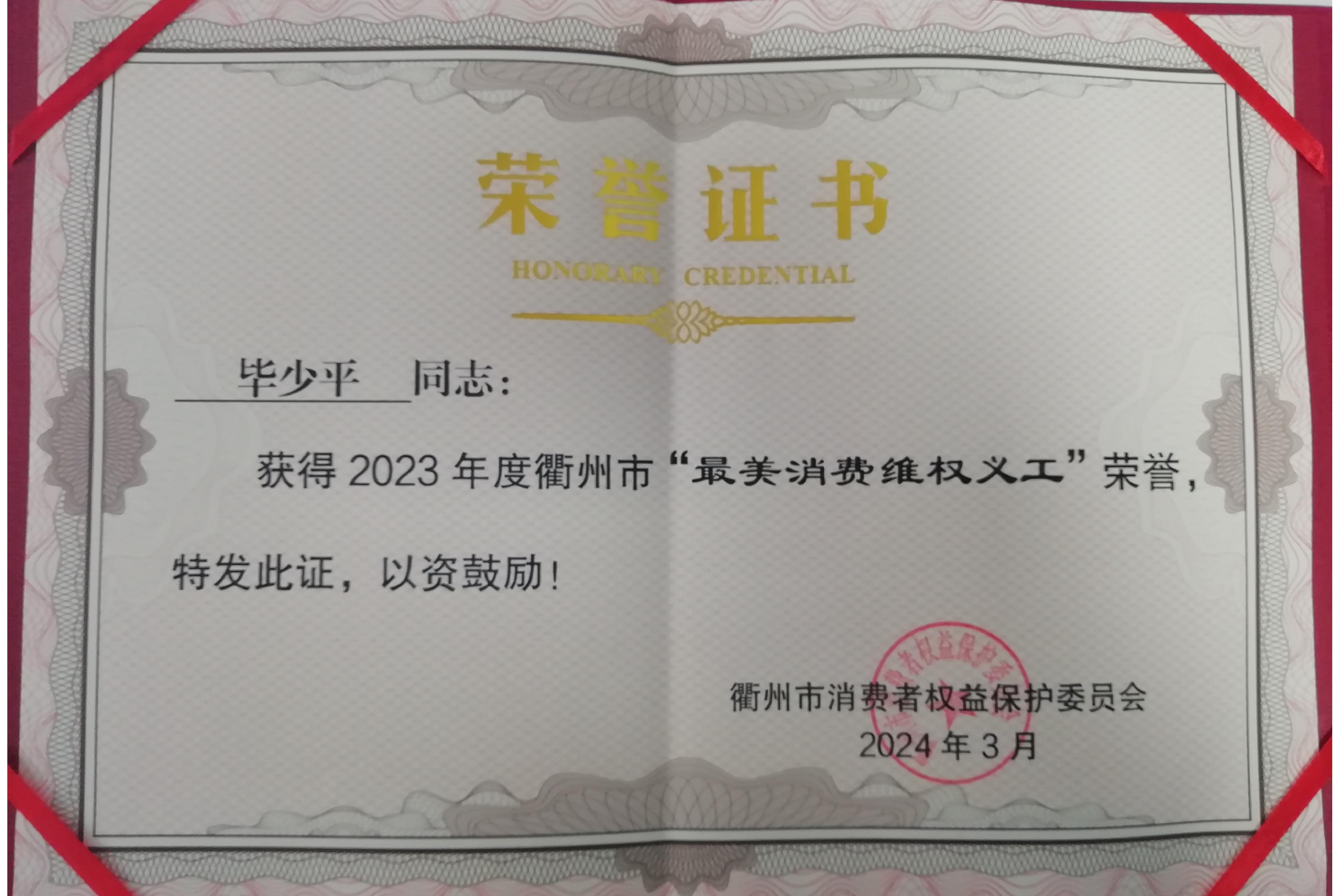 毕少平获2023年度最美消费维权义工.
