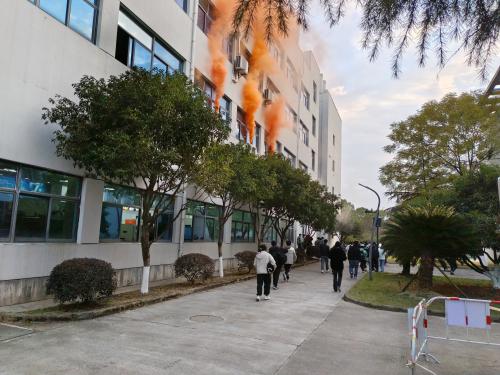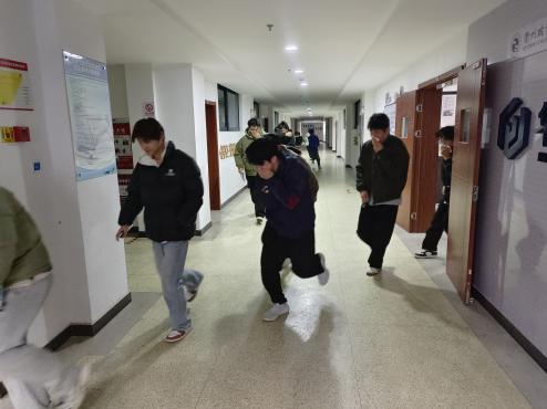 演练开始,模拟实训楼电气线路短路引发火情的警报声响起,浓烟发生器快速营造真实火场环境。在任课教师与实训教师的引导下,师生们迅速弯腰低姿,用纸巾捂住口鼻,沿预设安全通道快速有序撤离,避开实训设备密集区域,全程无拥挤踩踏,仅用时 1 分 15 秒便全部集结至指定安全区域,各班迅速清点人数并上报。
